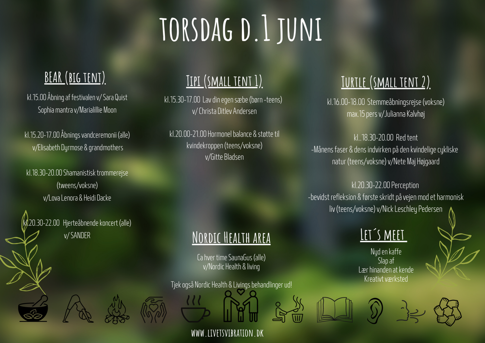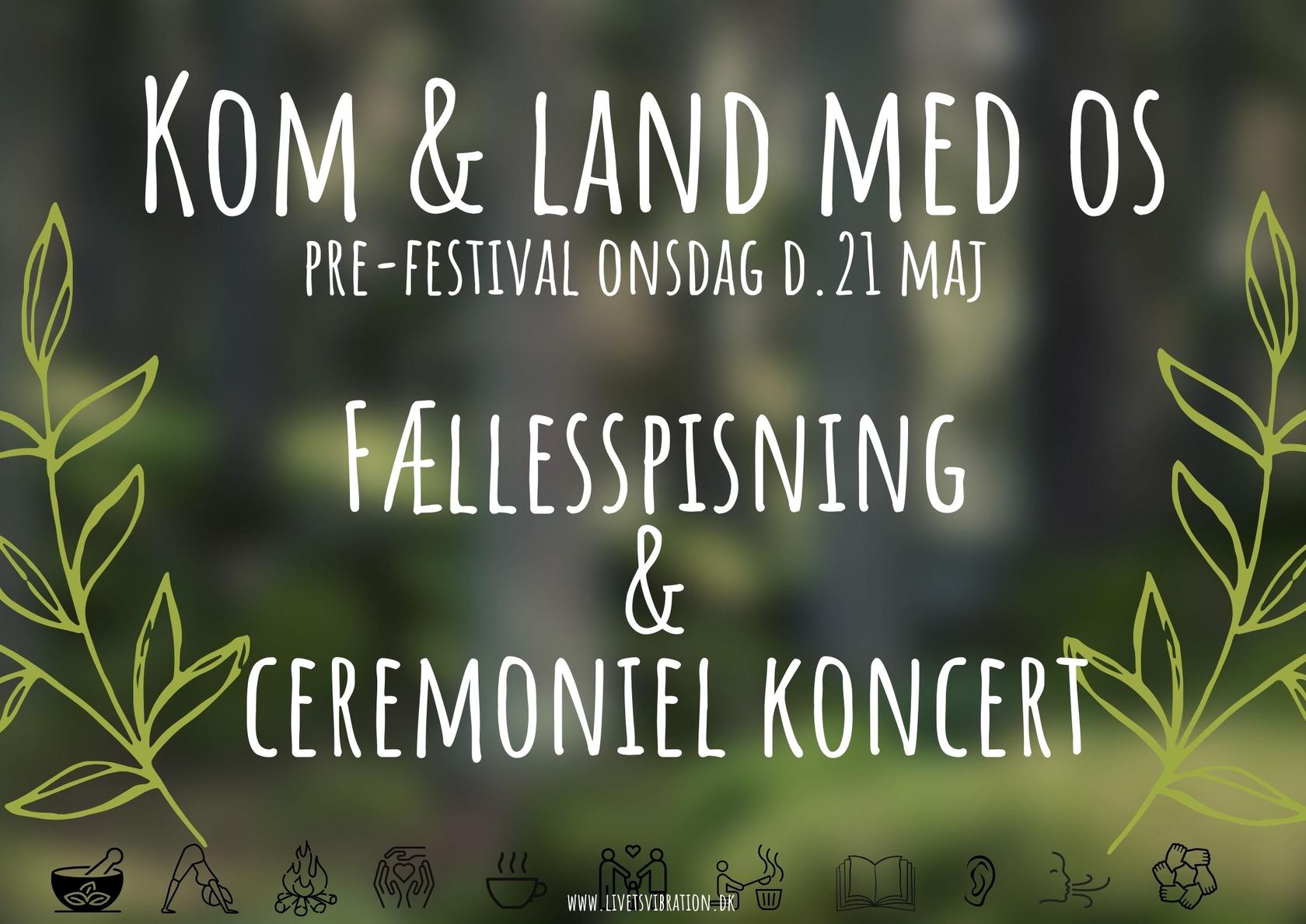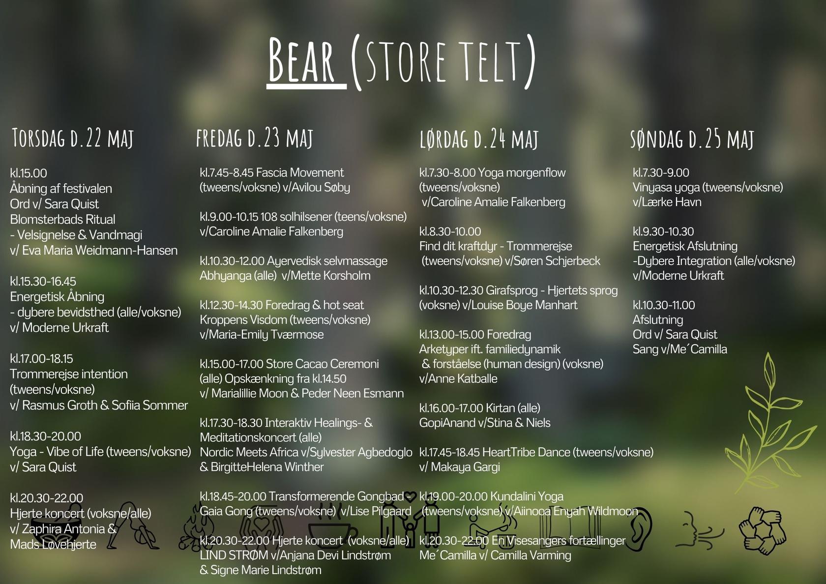 Som en ekstra gave, åbner vi op, for dem der ønsker at komme og lande om onsdagen. Der vil være mulighed for at tilkøbe et lækkert vegetarisk tidligt aften måltid og der er en smuk samlings koncert i det store Beartelt kl.19.30-21.00.