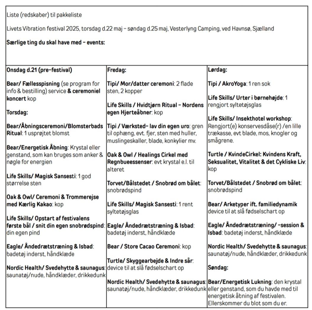 Efter tjek ind, og opsætning af vogn eller telt, kom da til FESTIVALENS TJEK IND SPOT (Du finder overblikket over festivalpladsen på www.livetsvibration.dk og på selve festivalpladsen, når du ankommer til Livets Vibration). Her vil du få festivalarmbåndet.