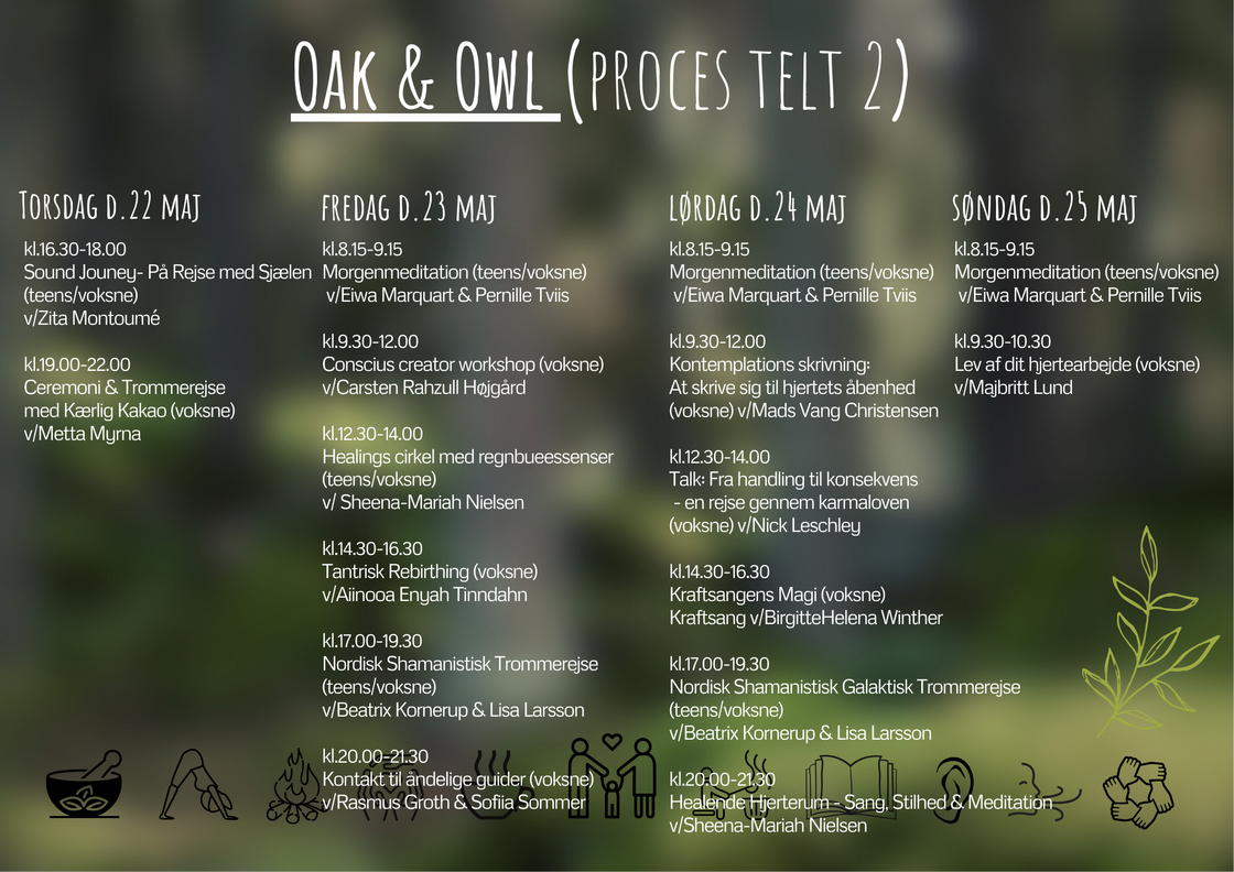 - kl.20.00-21.30: Kontakt til åndelige guider (voksne)(medbring:underlag, tæppe, pude, blindfolds, blok, pen & drikkedunk)